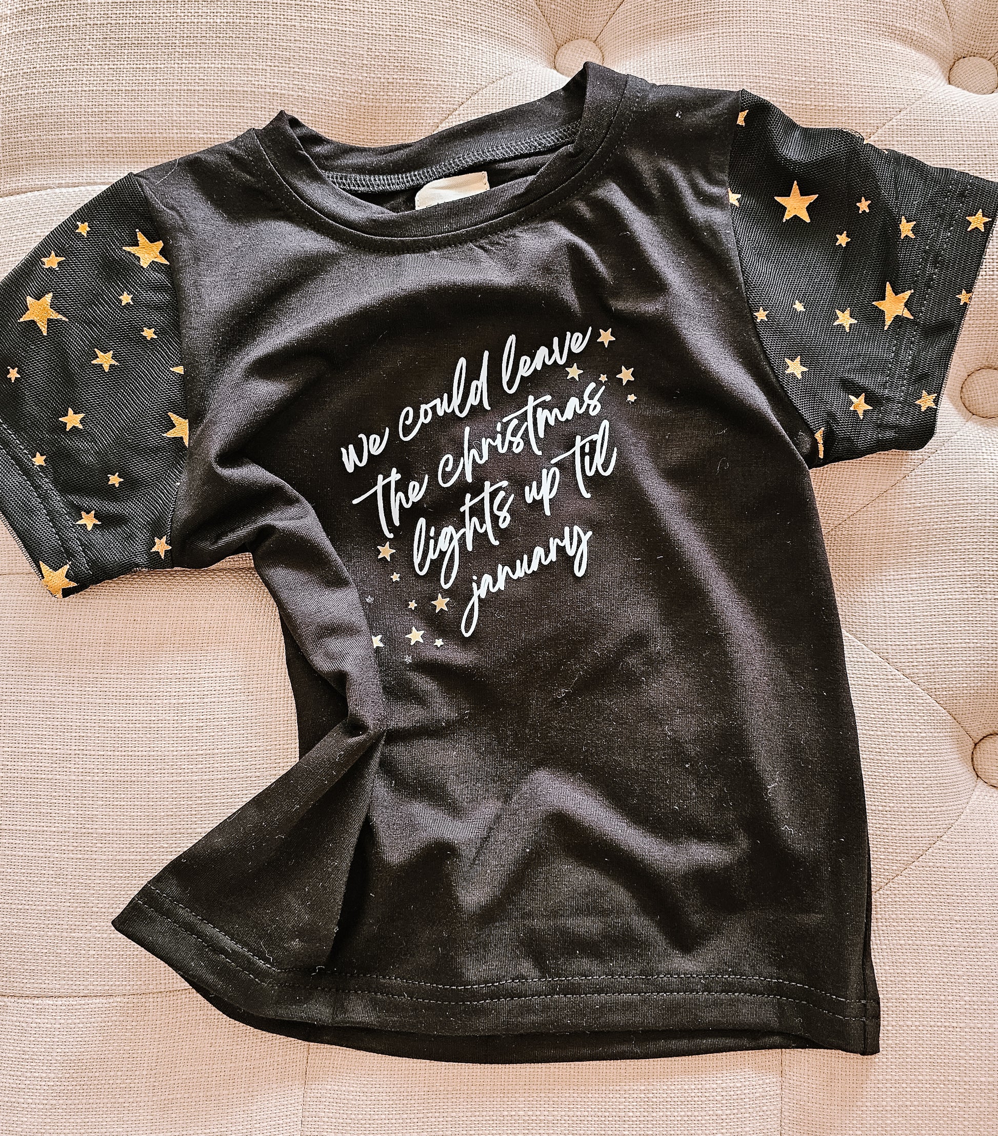 Black tshirt with color blocked sleeve & gold star over lay on the sleeve. Adorable matching stars on the shirt with detail.
