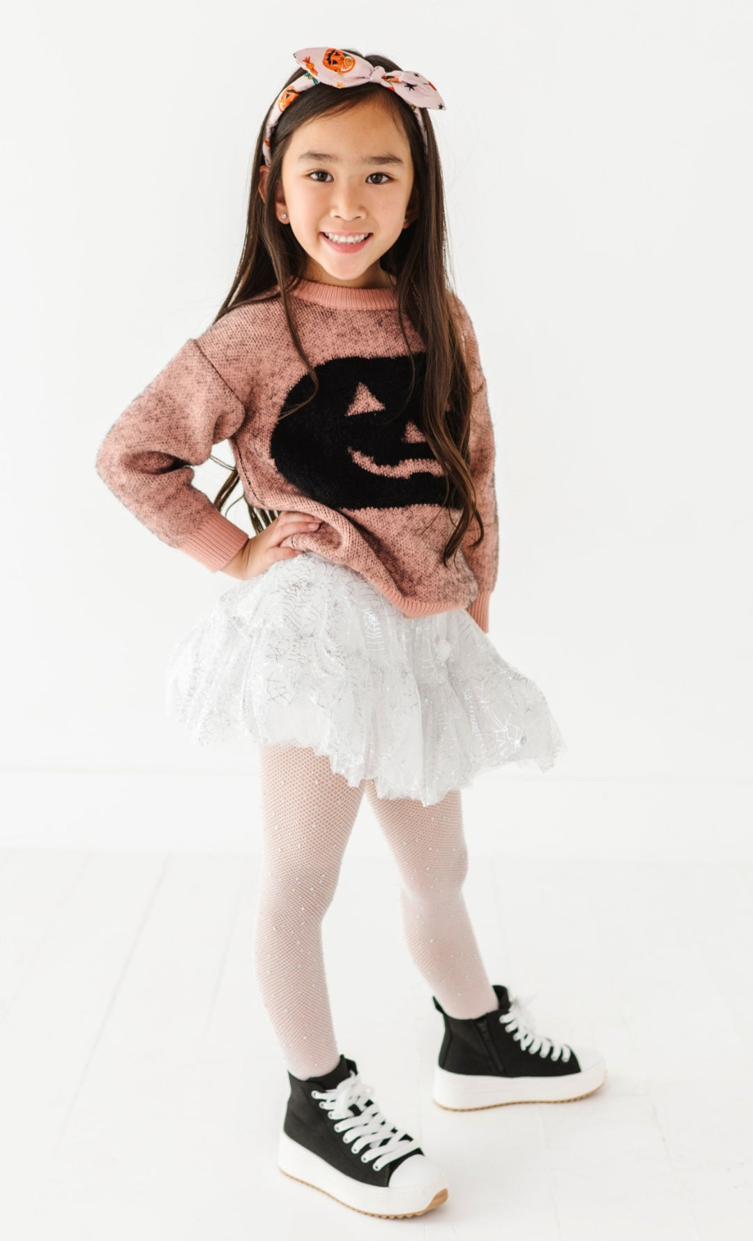 Our tiered fancy skort with adjustable waist tie & white bike shorts attached. Ready for spooky season in our white & silver web printed mesh!