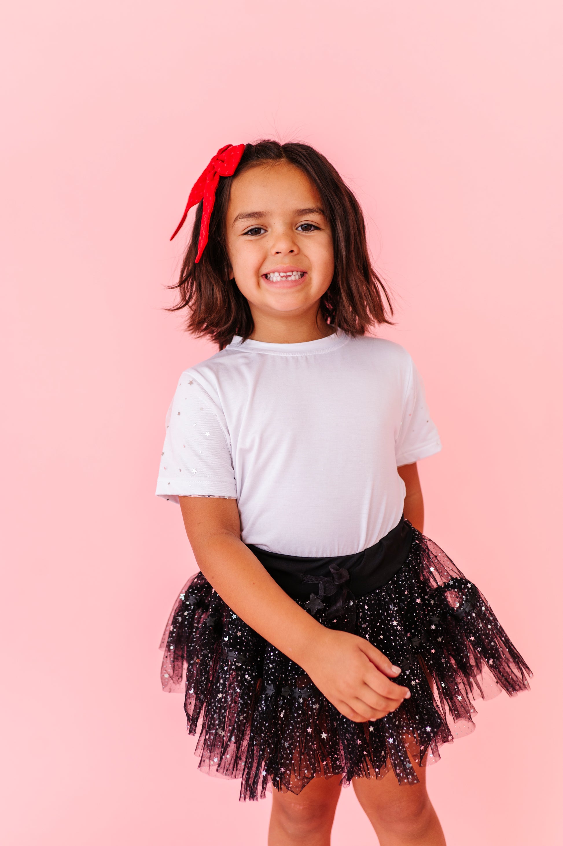 Sold soft tshirt with image & mesh overlay on the sleeve, matches our fancy skorts.