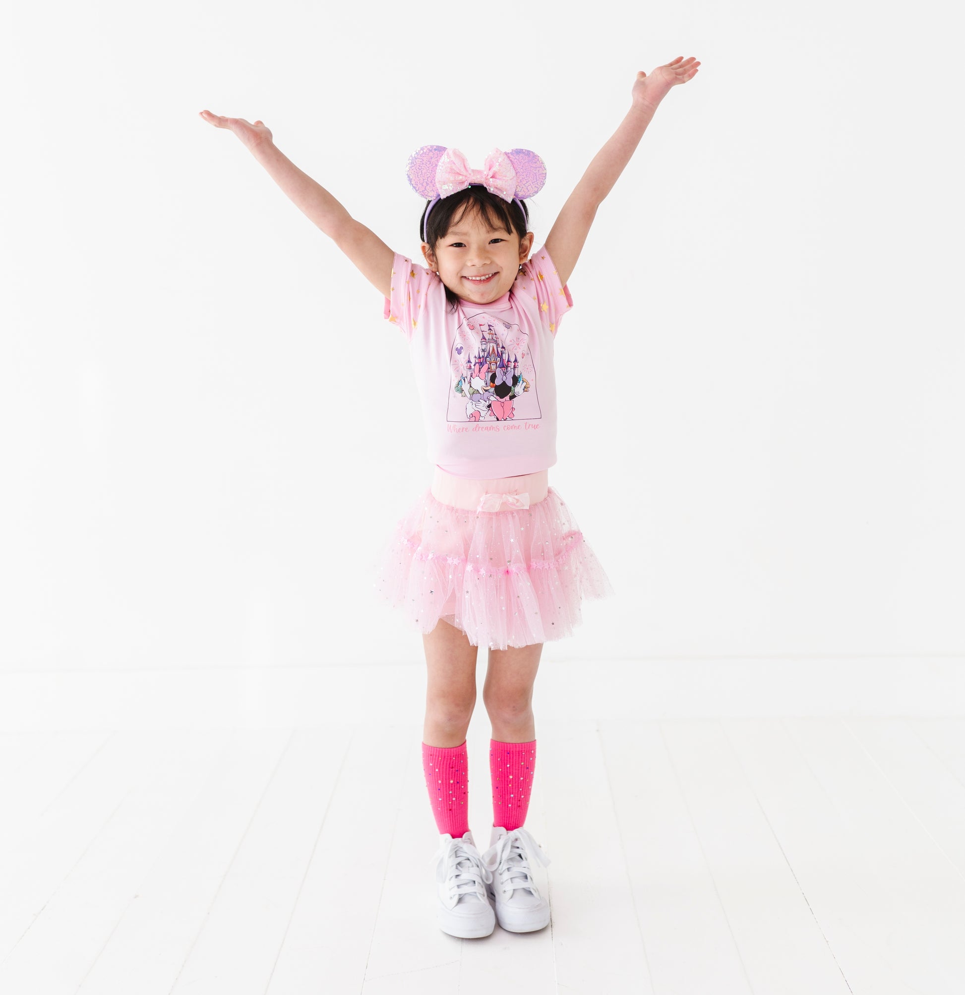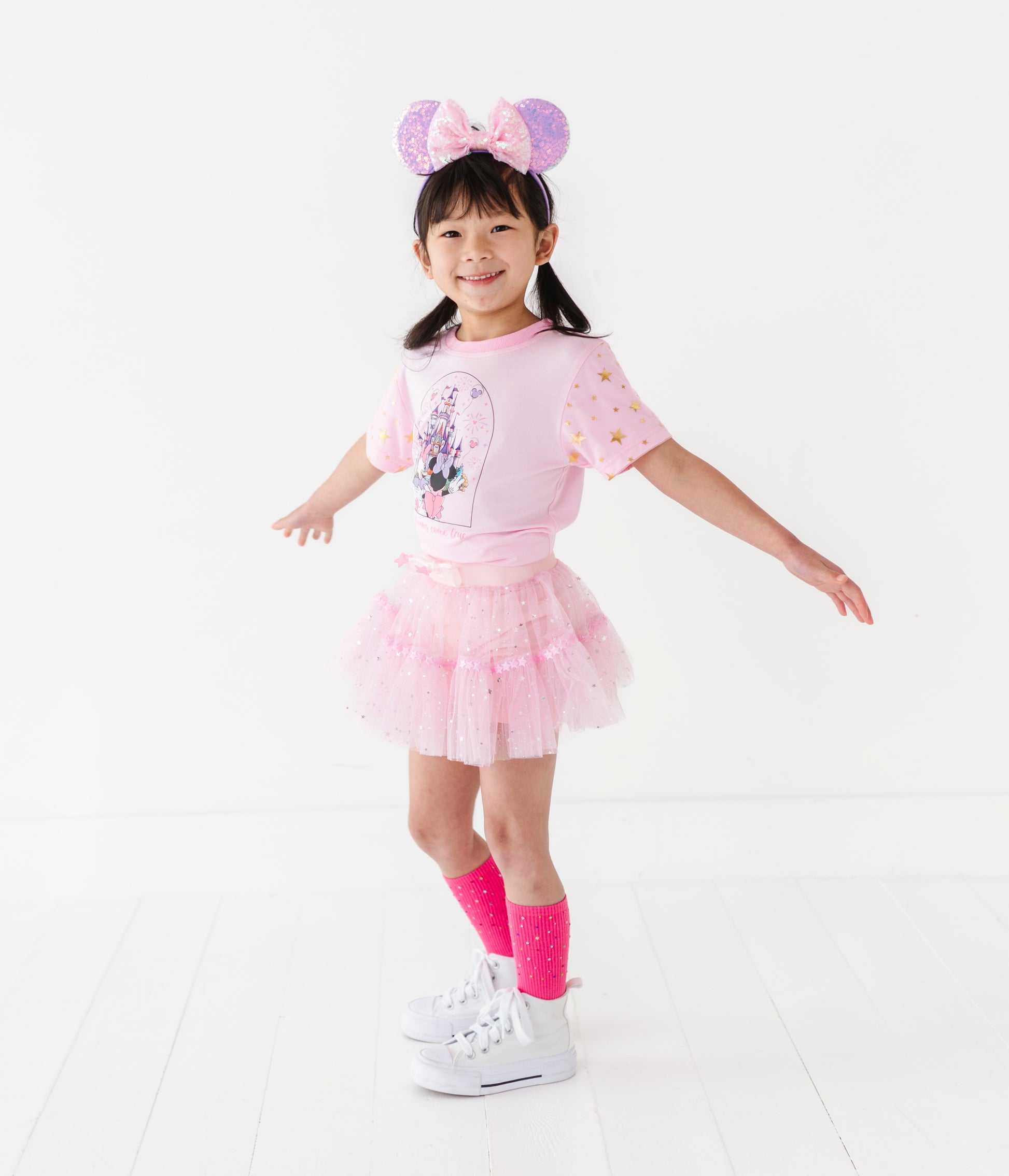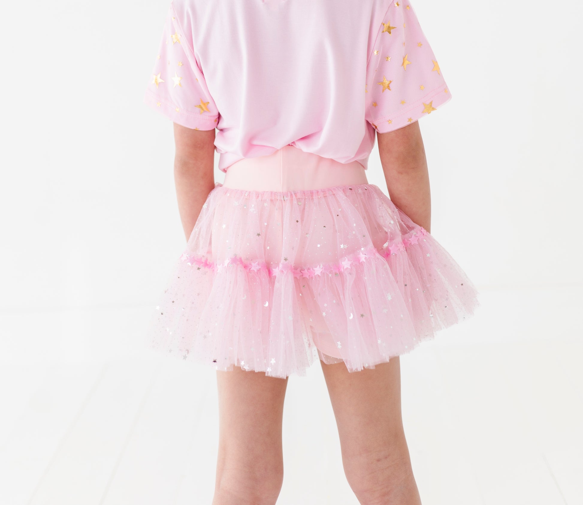 The mesh sequins star ruffle skirt layer is attached with a thick waist band & adjustable tie with star detail.