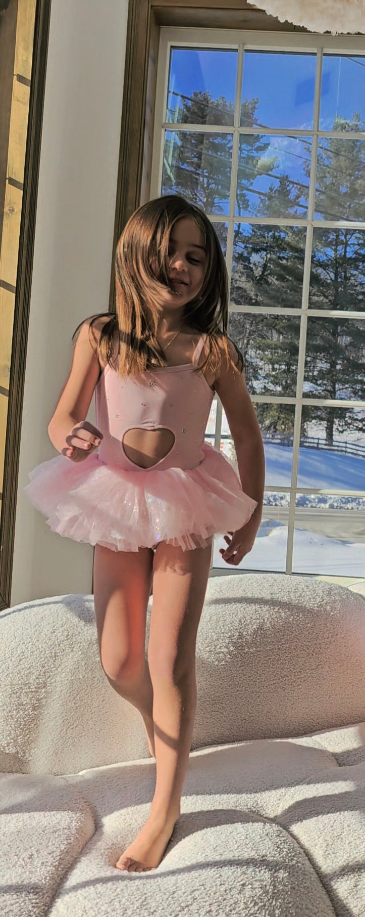 Our one piece light pink swim with heart cut out & tutu skirt. The swimsuit is gem stamped for some glam!